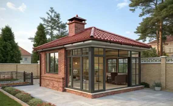 Остекление выполнено с использованием алюминиевого профиля в тёмной ламинации. Стиль панорамных окон и дверей с декоративной раскладкой идеально сочетается с облицовкой под кирпич. Применён профиль Provedal с глухими и открывающимися створками. Решение подчёркивает архитектуру участка и визуально расширяет пространство беседки.